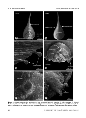 tail of the seed-scale; E: Detail of the bulge developed between the two ovules; F: Micropyle with two developing arms.